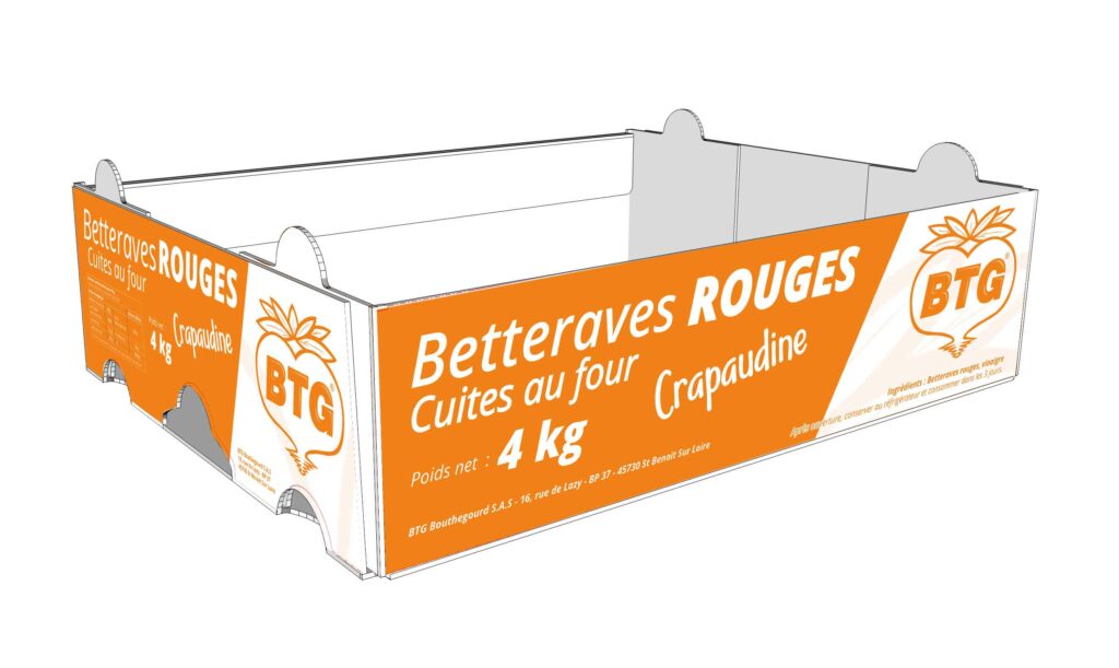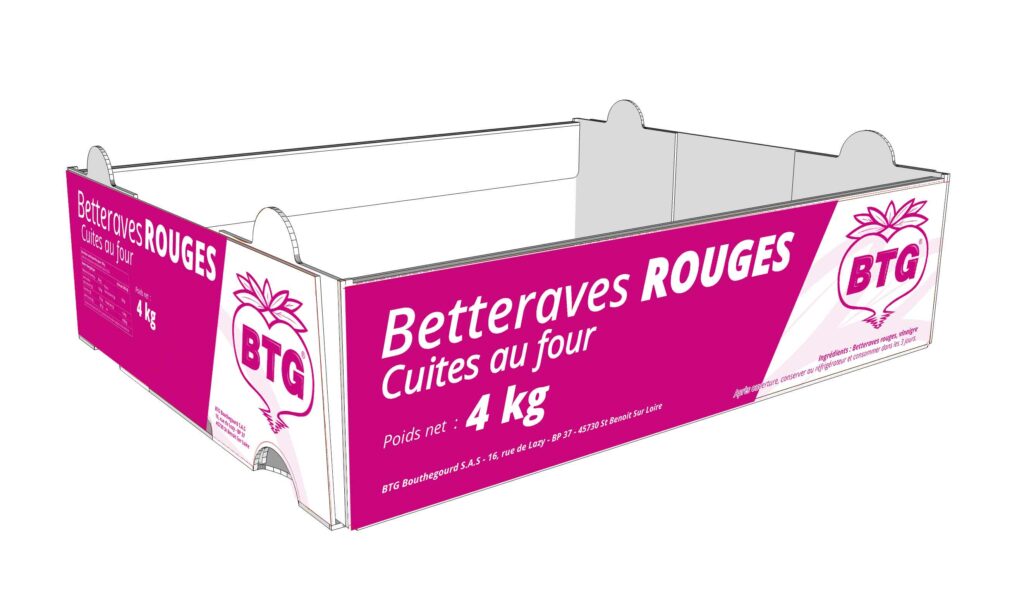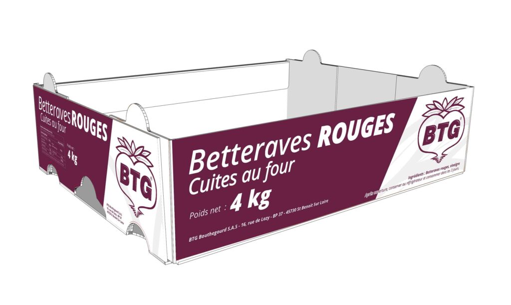 Betteraves rouges non épluchées cuites à la vapeur, trempées dans un bain de vinaigre puis conditionnées en plateaux bois de 10 kg Ingrédients : Betterave