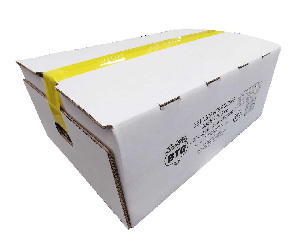 Betteraves rouges entières épluchées coupées en cubes cuites à la vapeur, conditionnées et stérilisées sous-vide en sachets de 2 kg.